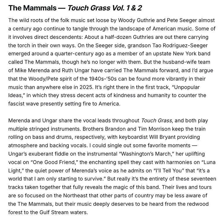 "The Mammals make music for the moment—and the movement. Anchored in the fertile folk traditions of the Hudson Valley, this fiercely independent band blends string-band swagger with indie-folk heart and a radical spirit that feels both deeply rooted and urgently current. Co-founded by Mike Merenda and Ruth Ungar (daughter of fiddle legend Jay Ungar), The Mammals emerged in the early 2000s with a mission: revive the rebel soul of Americana, and give it something real to say. And say something, they do. Their songs straddle the personal and political, moving from love ballads and front porch reflections to rally cries for environmental justice, labor rights, and community healing. It’s protest music with hooks—think Pete Seeger meets Wilco at a modern hootenanny. Their harmonies ache, their fiddles fly, and their lyrics don’t flinch. The Mammals aren’t here for nostalgia—they’re here to make folk music matter again. At a time when roots music can feel either too polished or too precious, The Mammals cut through with grit, grace, and a palpable sense of purpose. Whether they’re headlining a folk festival, recording in their own homegrown Humble Abode Studio, or showing up for a cause in their backyard, The Mammals carry on a living tradition: one where music doesn’t just entertain—it empowers”